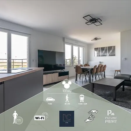 Disneyland-Paris 11Pers, 2Parkings, Wifi, Netflix lägenhet erbjuder ett komplett kök samt rum med soffa, te/kaffebryggare och sitthörna. Disneyland Resort Paris ligger 2 km från lägenheten, medan Aquarium Sea Life Paris Val D'Europe ligger cirka 1 km bort.